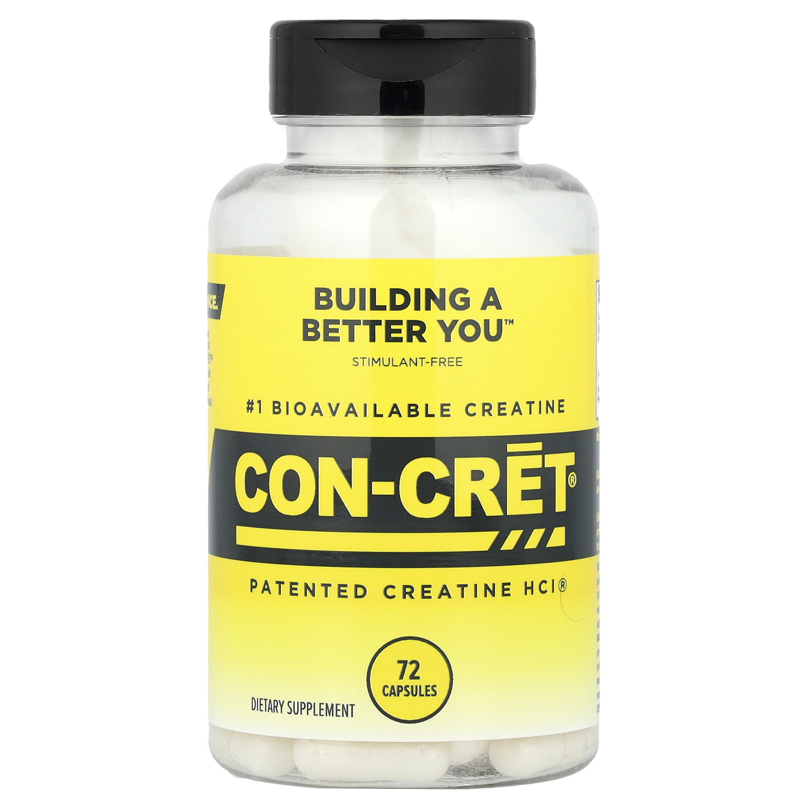 Building a Better You™ Stimulant-Free Patented Creatine HCl® Dietary Supplement Gluten Free No Calories No Carbs No Sugar Energy. Strength. Endurance. Capsules are Kosher, Vegan and Vegetarian. CON-CRET® Patented Creatine HCI® is a unique form of creatine. It is more soluble and bioavailable than all other creatine derivatives. Due to Micro-Dosing®, CON-CRET® provides all the benefits of creatine without unpleasant side effects.† Micro-Dosing® is based on your body weight and workout intensity. CON-CRET® is stackable with any workout supplement. No cycling† No loading † No cramping† No bloating† No water retention† Con-Cret® complies with all drug and doping control standards issued by professional and amateur athletic organizations. Con-Cret® is permissible for use by college student-athletes. †When used as directedSUGGESTED USE: