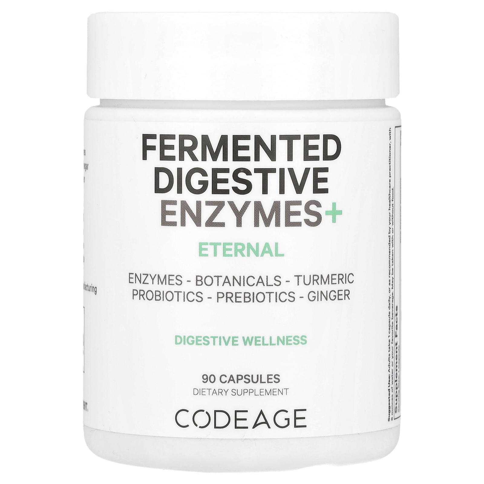 Eternal Enzymes, Botanicals, Turmeric Probiotic, Prebiotics, Ginger Digestive Wellness Dietary Supplement Multi Enzymes Apple Cider Vinegar Black Pepper Vegan Non GMO Soy Free Dairy Free Gluten Free cGMP Certified Manufacturing Feel Different® Codeage Fermented Digestive Enzymes is a comprehensive digestive supplement featuring 14 different food enzymes, probiotics, prebiotics, and organic botanicals, including apple cider vinegar, black pepper, ginger, kiwi, and turmeric to help support digestive health, digestive balance, and a healthy gut microbiome..SUGGESTED USE: