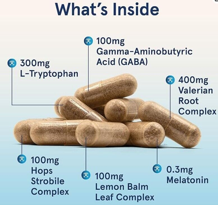 Valerian root and hops strobile complex help reduce sleep latency to fall asleep faster; GABA, lemon balm and L-tryptophan promote relaxation; melatonin reduces sleep latency and supports a healthy sleep cycle