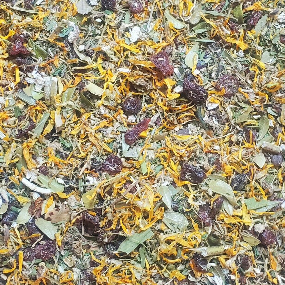 Golden Rod, Cleavers, Parsley Leaf, Marshmallow Root, Dried Cranberry, Horsetail, Dandelion Root, Ginger Root, Calendula, Uva Ursi Leaf