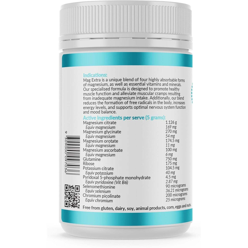 Product Information Mag Extra is a unique blend of four highly absorbable forms of magnesium, as well as essential vitamins and minerals. Our specialised formula is designed to promote healthy muscle function and alleviate muscular cramps resulting from inadequate magnesium intake. Additionally, our blend reduces the formation of free radicals in the body, increases energy levels, and supports optimal nervous system function and mood balance. Magnesium plays a vital role in numerous bodily functions, including energy production, muscle and nerve function, and maintaining healthy bones and teeth. When combined with D-Ribose, a sugar molecule involved in ATP production, Mag Extra enhances energy levels and promotes cardiovascular health. P5P, the active form of vitamin B6, supports proper neurotransmitter function and helps regulate mood and sleep patterns. Malic acid is known for its ability to enhance energy production by participating in the Krebs cycle, which generates ATP in the body. Lastly, L-Glutamine, an essential amino acid, supports muscle recovery, immune function, and digestive health. The combination of these elements creates a powerful synergy that promotes optimal energy production, muscle recovery, cognitive function, and overall metabolic health. Additionally, this complex may assistin reducing muscle fatigue, improving exercise performance, and promoting a healthy immune response. Regular supplementation of magnesium complex with D-Ribose, P5P, Malic Acid, and L-Glutamine can provide a valuable support system for individuals seeking to optimise their health and vitality. Mag Extra combines 4 of the most absorbable and digestive-friendly forms of magnesium: Magnesium glycinate - This form of magnesium has increased bioavailability, digestibility, taste, and efficacy compared to other forms. It is known for its calming properties as it is bound to a glycine molecule. This form of magnesium has been shown to support heart health, muscle function, and relieve muscle cramps and mild muscle spasms. - This non-acidic, buffered form of vitamin C is a natural neutral salt that has significantly higher gastrointestinal tolerance compared to other forms of vitamin C. Magnesium Citrate - This highly absorbable form of magnesium provides nutritional support for healthy muscle function. It is a blend of magnesium citrate and calcium citrate. Magnesium Orotate - This form of magnesium has been shown to support heart health, muscle function, and relieve muscle cramps and mild muscle spasms. Magnesium Ascorbate - This non-acidic, buffered form of vitamin C is a natural neutral salt that has significantly higher gastrointestinal tolerance compared to other forms of vitamin C. Directions: Adults: Mix one level teaspoon (5g) into 200ml of water. Consume once or twice daily, or as directed by your health professional. Warnings: Keep out of reach of children. Mag Extra contains selenium which is toxic in high doses. A daily dose for adults of 150 micrograms of selenium from dietary supplements should not be exceeded. Contains sugar. If you are pregnant or breastfeeding, talk to your health professional before use. Not suitable for use in children under the age of 12 months, except on health professional advice. If symptoms persist, talk to your health professional. Do not use if tamper evident seal is broken or missing. Refrigerate after opening. Store below 25°C. Ingredients: Amount per dose Magnesium citrate 1.126g equiv. magnesium 169mg Magnesium glycinate 270mg equiv. magnesium 54mg Magnesium orotate 174.5mg equiv. magnesium 11mg Magnesium ascorbate 100mg equiv. magnesium 6mg Total Magnesium 240mg Glutamine Ribose 750 mg Potassium citrate 175 mg equiv. potassium 104.5mg Pyridoxal 5-phosphate monohydrate 40mg equiv. pyridoxine (Vit B6) 4.5mg Selenomethionine 2.87mg equiv. selenium 90mcg Chromium picolinate 36.21mcg equiv. chromium 200mcg CPPMicronutrition Mag Extra Powder 150g