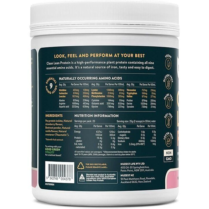 DetailsClean Lean Protein is powerfully plant-based and contains all nine essential amino acids. It’s a natural source of iron and encourages recovery, vitality, muscle repair and growth. From seed to tub, we use only the ingredients you need, and the cleanest processing required to bring them to you. Better for you. Better for the environment.Clean Lean Protein is made from 100% European golden peas, grown in Northern France under strict controls to ensure their purity. We use water-based technology to isolate the protein and remove anti-nutrients without any solvents or nasty chemicals.Golden peas are among the most sustainable protein sources available - returning nitrogen to the soil, using relatively little water compared to other crops, and yielding far more protein per unit of land area than livestock (e.g. cattle or poultry) or other vegetable crops. Low in sugar & carbohydrates Easily digested All 9 essential amino acids Dairy free, lectin free and low in phytates, Clean Lean Protein doesn’t cause bloating or gut inflammation. High in protein (up to 20g / 25g serve) and with 50% more glutamine than whey. Free from all common allergens and suitable for the whole family. How to Use:Add 2 scoops (25g) to a shaker with 350ml of water and shake. It is also great in smoothies!Warnings:Always read the label and use only as directed.Store in a cool dry place below 25°C, away from direct sunlight. Refrigerate after opening and use within 100 days.Ingredients:Pea protein isolate, Natural Strawberry flavour, Beetroot powder, Natural sweetener (Thaumatin^). ^Katemfe fruit extract.CPP