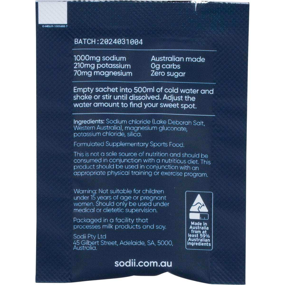 Sodii Everyday Hydration Salts are the perfect solution to stay hydrated throughout your busy day. With 30 packets of unflavoured salt, you can easily replenish your body's electrolytes and maintain optimal hydration levels. Stay energized and focused with this scientifically formulated product. Ingredients Salt (Lake Deborah), Potassium Chloride, Magnesium Gluconate, Silica. CPP